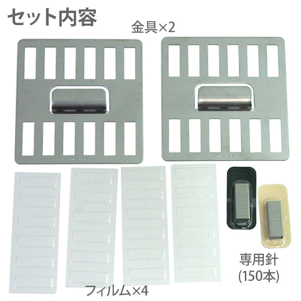 セット内容金具:2枚、フィルム:4枚、専用針:2個(150本)、説明書:1枚