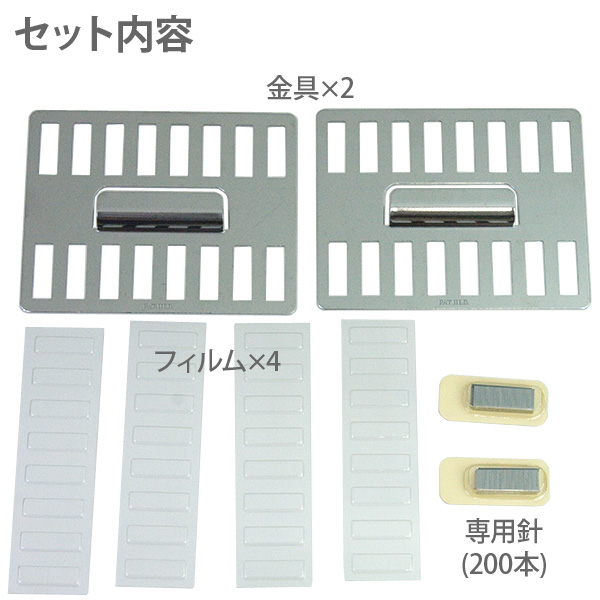 セット内容金具:2枚、フィルム:4枚、専用針:2個(200本)、説明書:1枚