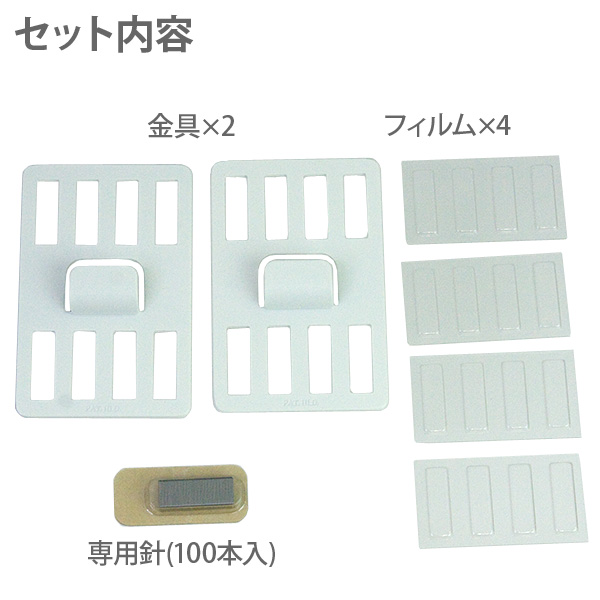 セット内容金具(白):2枚、フィルム:4枚、専用針:1個(100本入)、説明書:1枚
