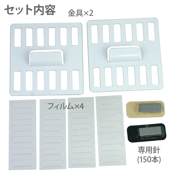 セット内容金具(白):2枚、フィルム:4枚、専用針:2個(150本)、説明書:1枚