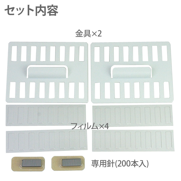 セット内容金具(白):2枚、フィルム:4枚、専用針:2個(200本)、説明書:1枚