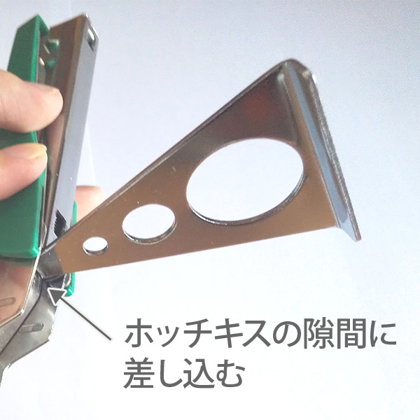 使い方180度に開くタイプのホッチキスに差込み、壁への打ち込みをスムーズにする補助アイテムです。