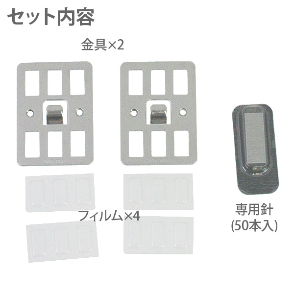 セット内容金具:2枚、フィルム:4枚、専用針:1個(50本入)、説明書:1枚