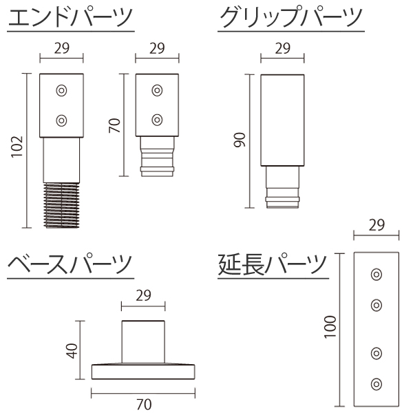 セット内容ベースパーツ×2/エンドパーツ×2/グリップパーツ×1/延長パーツ×1/バネ×1/ネジ(φ3×10mm)9本