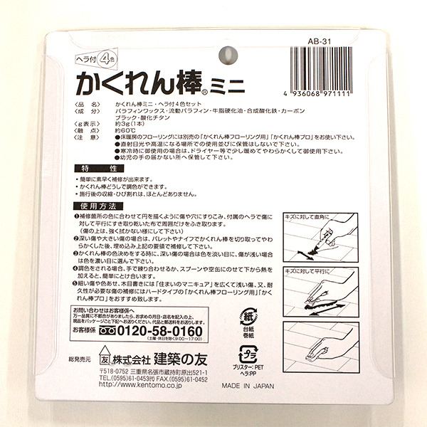 HOME > 修理・補修・便利用品 > 壁紙補修  > 建築の友 かくれん棒ミニ4色セット