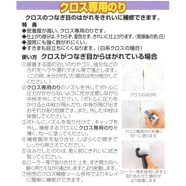 ・クロスのはがれ補修後クロスのつなぎ目が目立つ場合、別売の「クロスのすきまシール」で補修してください。